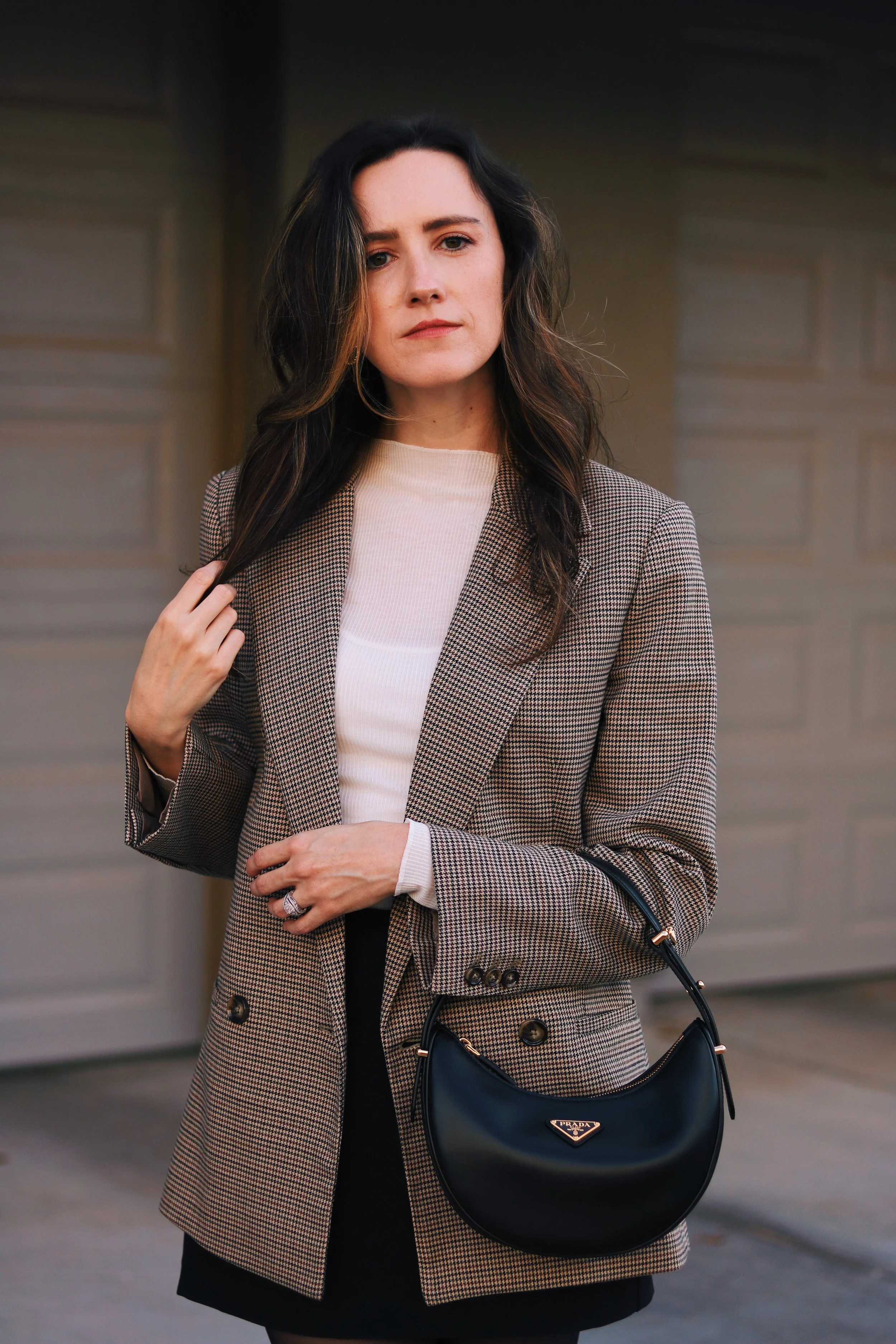 I was specifically on the hunt for a classic blazer in a neutral color but I wasnât totally set on getting black. I was looking at some brown and cream tones, and then when I stumbled on this plaid option I knew it was a winner! It was giving me Blaire Waldorf vibes which Iâm all for đ The print and silhouette are so timeless and I know Iâll be able to style it so many ways for years to come! I wanted my first outfit styling it to be with this mini skirt, sheer black tights, and my new Prada bag that I bought in Florence! This outfit screams âParisian Chicâ to me and makes me want to hop on the next flight to Paris.